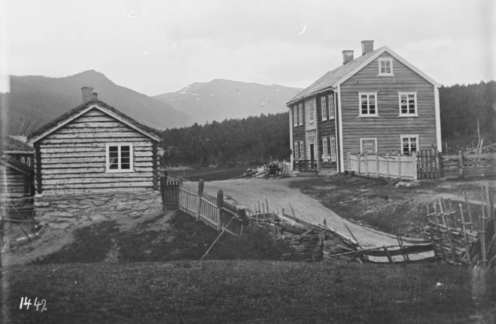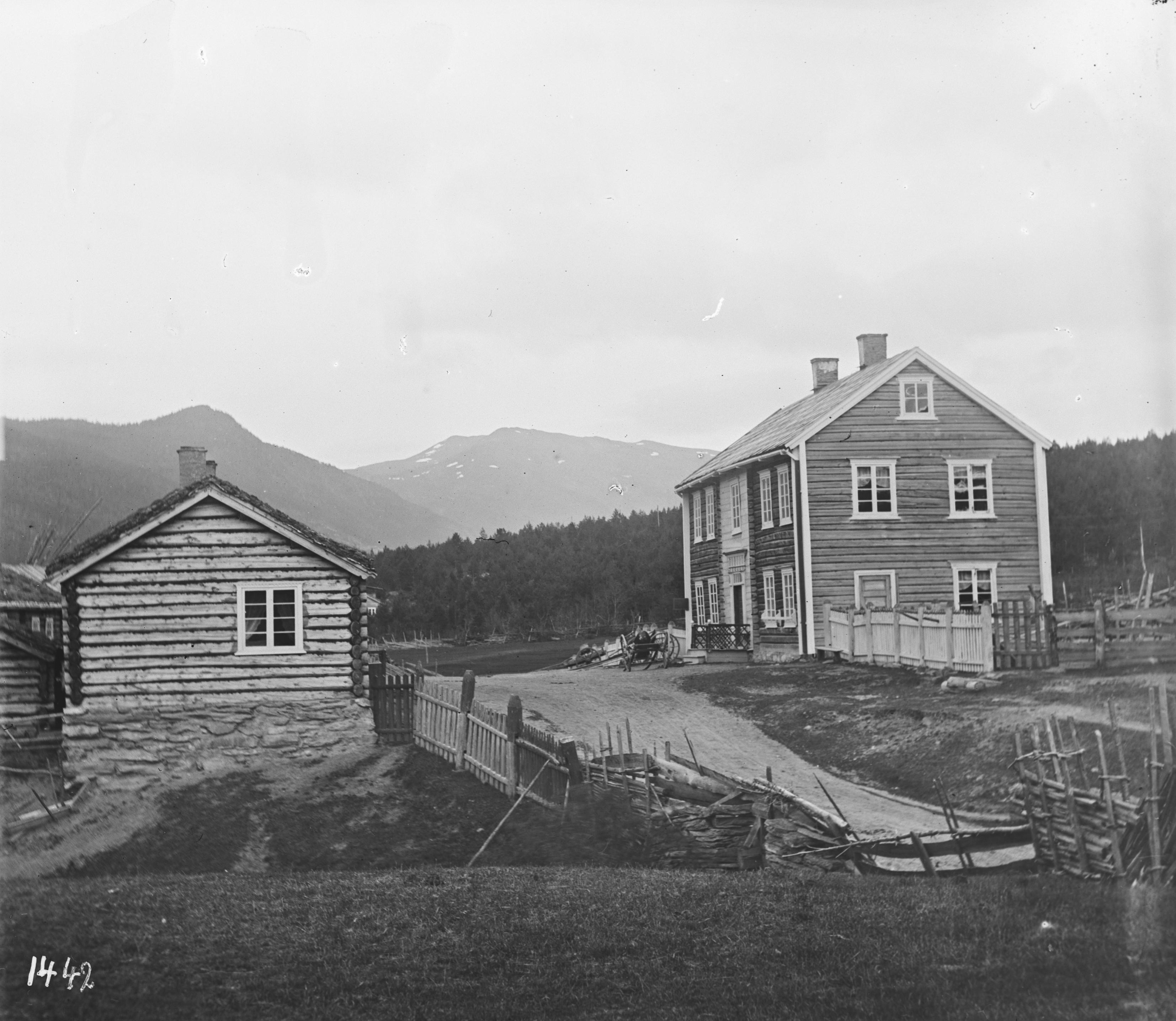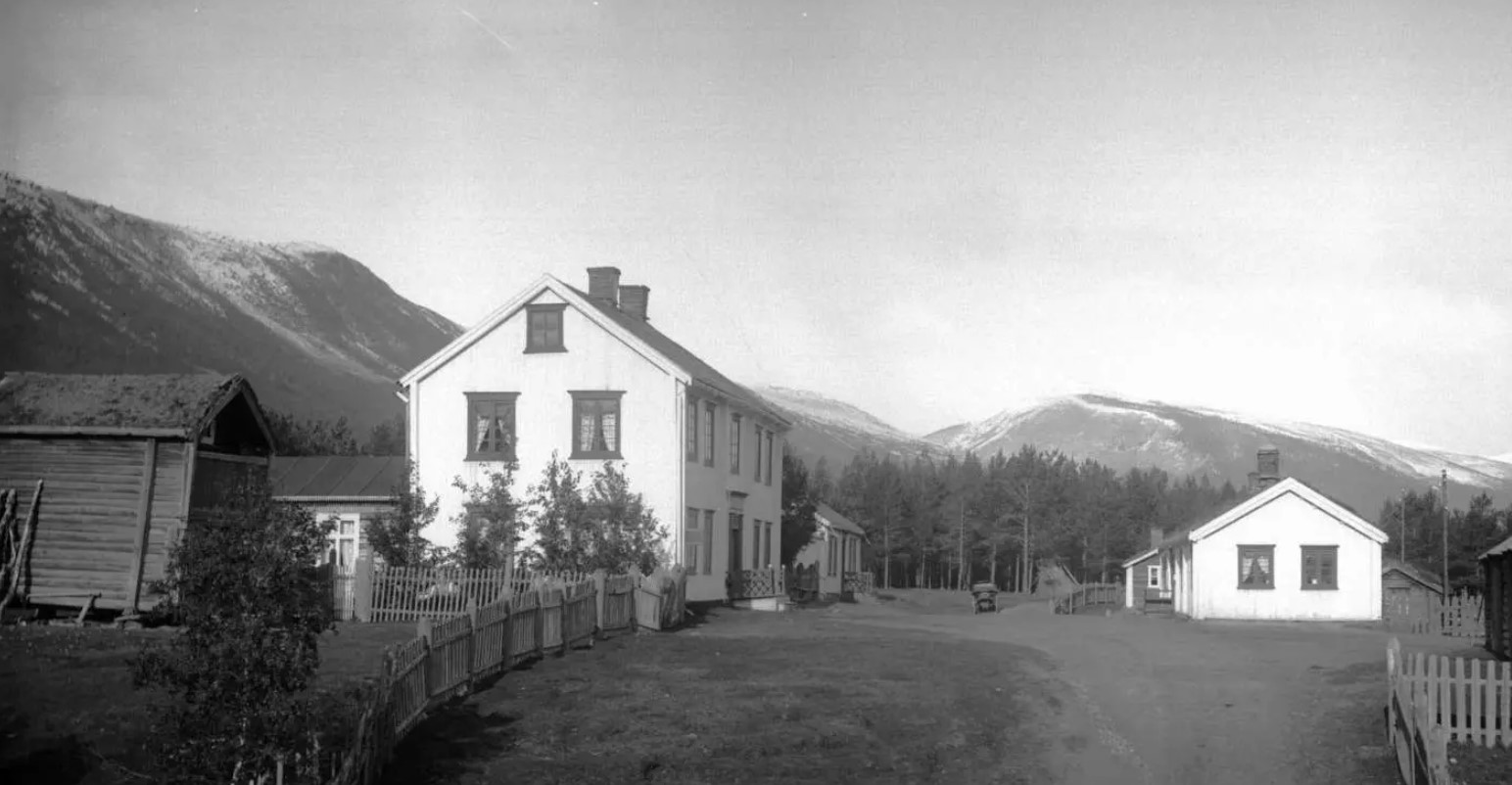 Brennhaugen hotell med eit påbygg som var spisesal. Nord for hotellet våningshuset der Brækken Cafe kom i 1920. På nedre sida av vegen, det første huset som var brukt som skysstasjon. Der kom seinare Brennhaug Kooperative Innkjøpslag. Litt lenger nord ser ein Kuskestugu. 13.09.1902 Foto: Hans H. Lie