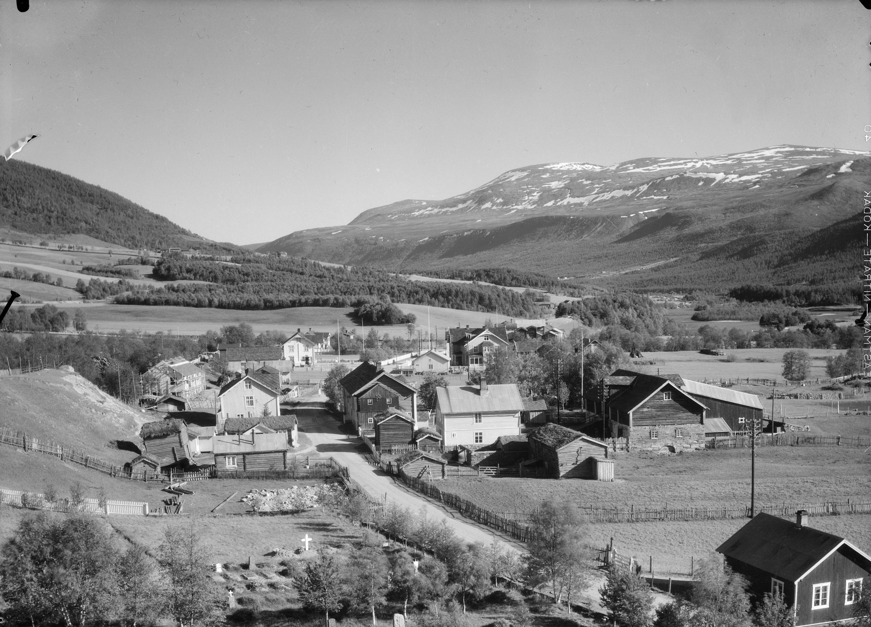Dovre sentrum teke frå kyrkjetårnet. På venstre sida av vegen ser ein fyrst øvre Kyrkjestugugarden. Fyrste huset tilhøyrde Marit Toftelien. Bak der er huset til Anne og Håkon Kirkestuen. Litt til venstre for desse to husa står stova til Maria Kirkestuen. Så kjem øvre stova tilhørendehotellet. Over taket her skimtar ein stova til Vigerustjentene Mari og Maria, og bak der att Steinmokafeen. Pakkhuset til Steinmo står på tvert av vegen (det store huset). Steinmobutikken med inngang mot fotografen. Bak Steinmobutikken er Løvmokafeen (kvitt) og Amli. På høgre sida er fyrst huset til Barbro Kirkestuen (og Ola). Her var det fiskebutikk. Vidare fjoset og nautgarden til øvre Kirkestuen. Så kjem hotellet. Mellom hotellet og Båsto er den gamle kooperativen, seinare skulehus. Og bak Båsto, Gurihaug. Baker Pedersen held på å byggje til venstre bak Kirkestuen Rundt 1933 Foto: Hans Joramo/Maihaugen